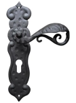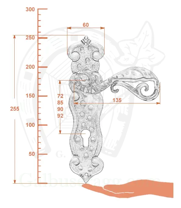 Klamka Kajmiła 507 na szyldzie długim z otworem na wkładkę patentową wykonana jest z kutego żelaza i dostępna w trzynastu powłokach kolorystycznych. Dzięki temu okucie znajduje zastosowanie zarówno do drzwi wewnętrznych, jak i zewnętrznych narażonych na wpływy atmosferyczne. Produkt oryginalnie włoski, wykonany przez firmę Galbusera G.&G.